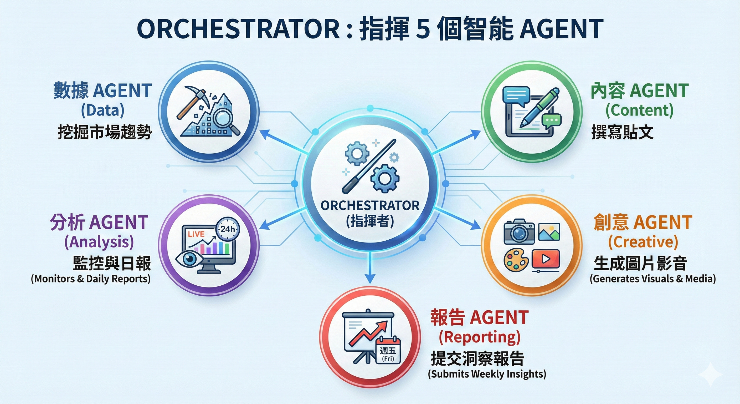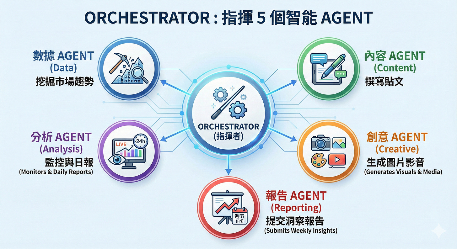 想像一下,一位行銷經理不再需要自己拉報表、寫文案、修圖。在 2026 年,他將指揮五個專門的 Agent:
